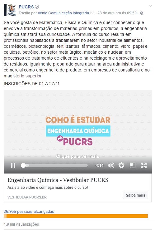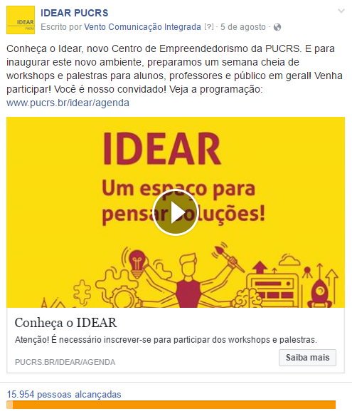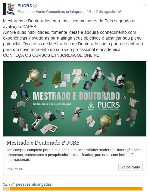 Sempre em sintonia com as inovações da mídia, a Vento Comunicação desenvolve estratégias e ações em marketing digital. Realizamos diversas campanhas digitais para a PUCRS, incluindo os vestibulares de verão e inverno, cursos MBA e especialização, cursos de extensão, mestrado e doutorado, entre outros. Os formatos mais utilizados são cards, carrossel, vídeo e banners, além de anúncios de texto para Google Adwords e Facebook Ads.
